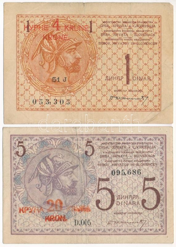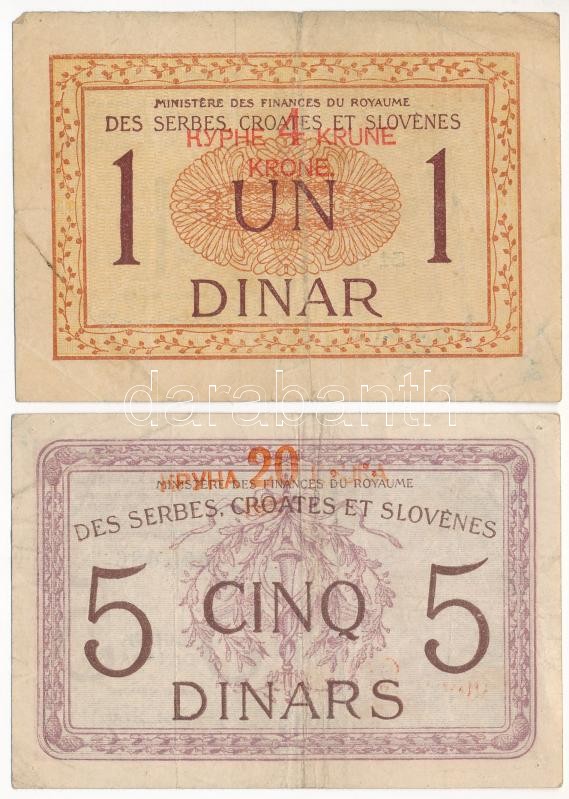 Kingdom of the Serbs, Croats and Slovenes 1919. 1 Dinar + 5 Dinara with "20 Kronen" overprint C:F,VG small tears, holes