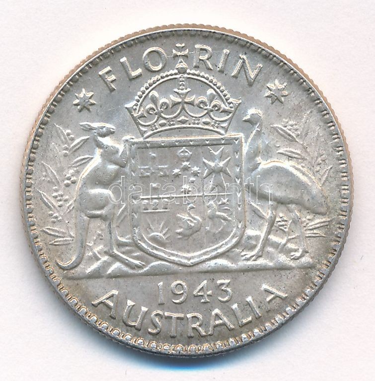 Australia 1943. 1... https://www.darabanth.com/hu/426-Gyorsarveres/426.0/Numizmatika/Kulfoldi-fem-es-ezustpenzek~2000015/Ausztralia-1943-1Fl-Ag-VI-Gyorgy-T2--Australia-1943-1-Florin-Ag-George-VI-CXF--Krause-K~II2721640