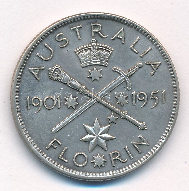 Australia 1... https://www.darabanth.com/hu/426-Gyorsarveres/426.0/Numizmatika/Kulfoldi-fem-es-ezustpenzek~2000015/Ausztralia-1951-1Fl-Ag-50-eves-jubileum-T1--Australia-1951-1-Florin-Ag-50th-Year-Jubilee-C~II2721583