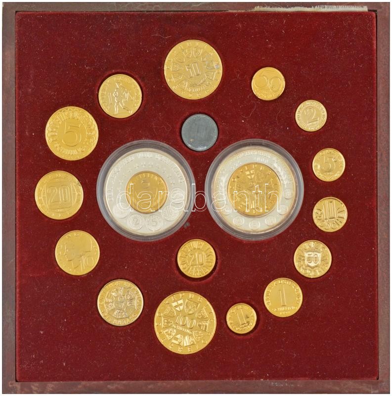 Ausztria 1947-2000. 18xklf érme- és 2xklf éremtétel a Schilling történetéről használt állapotú fa díszdobozban. Az érmék 1 kivételével aranyozva. Benne: 1947. 1gr aranyozott Zn + 1957. 2gr aranyozott Al + 1968. 5gr aranyozott Zn + 1949. 10gr Zn + 1994. 10gr aranyozott Al + 1951. 20gr aranyozott sárgaréz + 1947. 50gr aranyozott Al + 1965. 50gr aranyozott Al-bronz + 1947. 1Sch aranyozott Al + 1998. 1Sch aranyozott Al-bronz + 1952. 5Sch aranyozott Al + 1998. 5Sch aranyozott Cu-Ni és "Der Abschied von Schilling" kétoldalas, jelzett Ag emlékérem (50mm/0.999/49,16g) egy kapszulában + 1974. 10Sch aranyozott Cu-Ni + 1980. 20Sch aranyozott Al-Ni-bronz + 1964. 25Sch aranyozott Ag és "75 Jahre Österreichser Schilling" kétoldalas, jelzett Ag emlékérem (50mm/0.999/49,12g) egy kapszulában + 1963. 50Sch aranyozott Ag "Tirol 600 éve egyesült Ausztriával" + 2000. 50Sch aranyozott bimetál "Sigmund Freud" + 1979. 100Sch aranyozott Ag "Bregenz" T:1-3 Austria 1947-2000. 18xdiff coin- and 2xdiff medallion lot about history of the Schilling, in a used condition wooden case. All coins gilt but one. Within: 1947. 1 Groschen gilt Zn + 1957. 2 Groschen gilt Al + 1968. 5 Groschen gilt Zn + 1949. 10 Groschen Zn + 1994. 10 Groschen gilt Al + 1951. 20 Groschen gilt brass + 1947. 50 Groschen gilt Al + 1965. 50 Groschen gilt Al-bronze + 1947. 1 Schilling gilt Al + 1998. 1 Schilling gilt Al-bronz + 1952. 5 Schilling gilt Al + 1998. 5 Schilling gilt Cu-Ni and "Der Abschied von Schilling" two-sided, marked Ag medallion (50mm/0.999/49,16g) in one capsule + 1974. 10 Schilling gilt Cu-Ni + 1980. 20 Schilling gilt Al-Ni-bronze + 1964. 25 Schilling gilt Ag and "75 Jahre Österreichser Schilling" two-sided, marked Ag medallion (50mm/0.999/49,12g) in one capsule + 1963. 50 Schilling gilt Ag "600th Anniversary of the Austria - Tyrol Union" + 2000. 50 Schilling gilt bimetallic "Sigmund Freud" + 1979. 100 Schilling gilt Ag "Bregenz" C:UNC-F