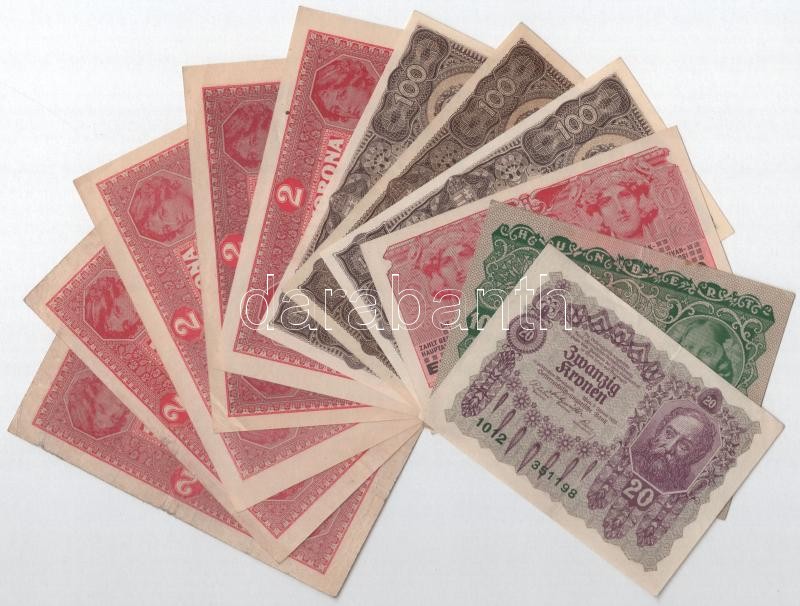 Leírás: 1916. 1K + 1917. 2K (5x) + 1923. 100K (3x) + Ausztria 1922. 20K + 100K T:I-III
