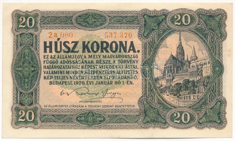 1920. 20K "2a 080 537.370" T:I- Adamo K15 https://www.darabanth.com/hu/426-Gyorsarveres/426.0/Numizmatika/Magyar-bankjegyek~2000007/1920-20K-2a-080-537370-TI-Adamo-K15~II2720528