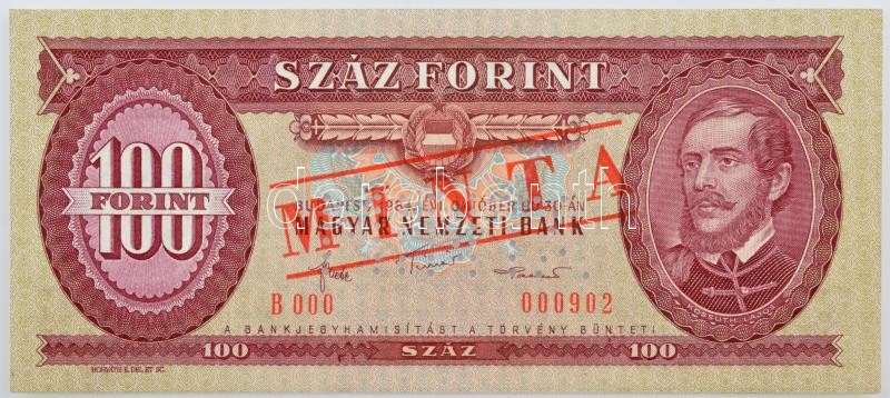 Leírás: 1984. 100Ft "B 000 - 000902" sorozat és sorszámmal illetve piros "MINTA" felülnyomással és perforációval T:I
