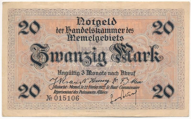 Krause... https://www.darabanth.com/hu/426-Gyorsarveres/426.0/Numizmatika/Papir-es-fem-szuksegpenzek~2000006/Memel-videk-1922-20M-TIII-Memel-Territory-1922-20-Mark-CF-Krause-P236~II2719878