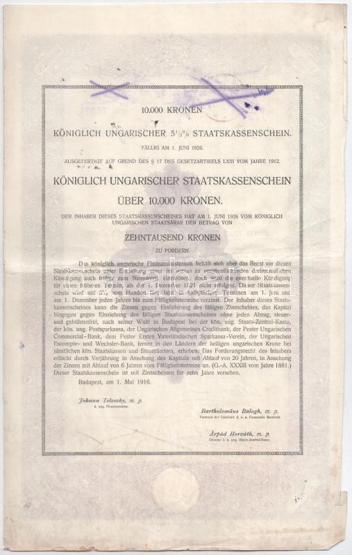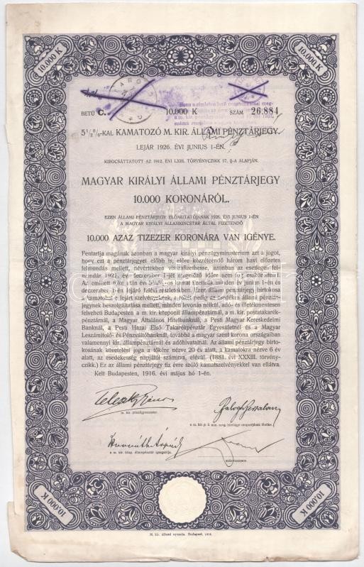Budapest 1916. "Magyar Királyi Állami Pénztárjegy" 10.000K-ról felülbélyegzésekkel, szárazpecséttel, áthúzásokkal érvénytelenítve T:II- széleken kisebb szakadások
