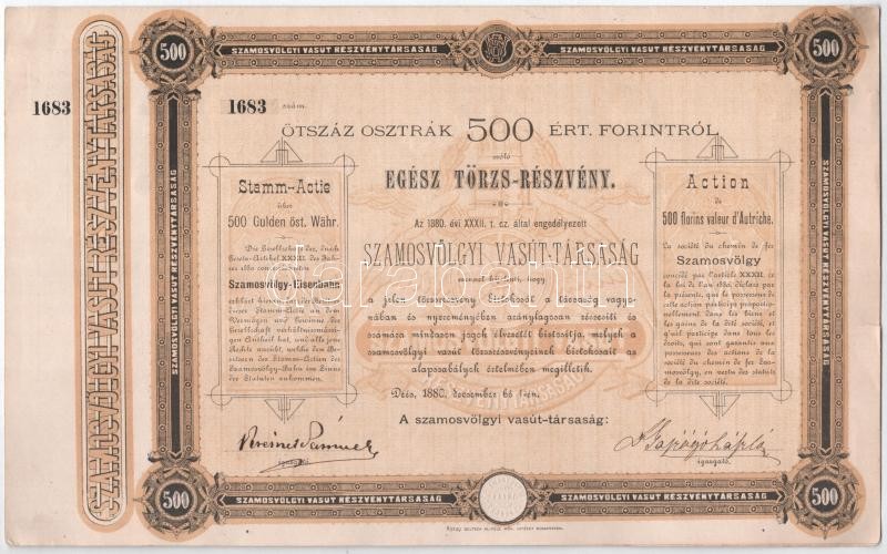 Deés 1880. "Szamosvölgyi Vasút-Társaság" egész törzsrészvénye 500Ft-ról, magyar, osztrák és francia nyelven, szárazpecséttel és szelvényekkel T:II,II- fo.