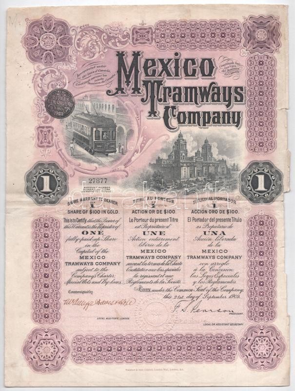 Nagy-Britannia / London 1909. "Mexikói Villamos Társaság" részvénye 100$-ról szárazpecséttel, szelvényekkel T:III ragasztónyom, tűlyukak, széleken szakadások