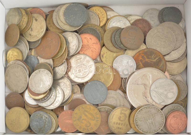 ~1100g mixed hungarian but mostly foreign circulating and commemorative coin lot in a cardboard box, in it Great Britain 1981. 25 New Pence Cu-Ni "Wedding of Prince Charles and Lady Diana" + Ireland 1935. 1 Pingin bronze + Portugal 1928. 1 Escudo Cu-Ni C:mixed