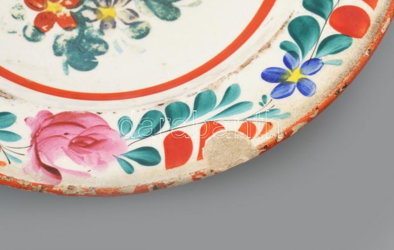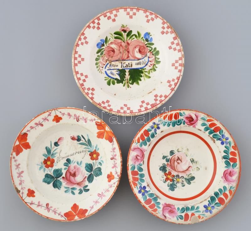 3 db népi fajansz tányér, sérülésekkel, d: 23 cm
