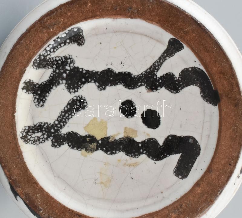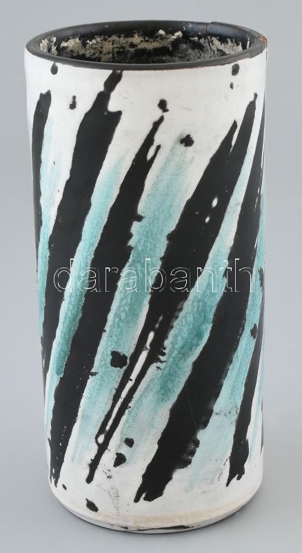 Leírás: Gorka Lívia (1925 - 2011): Váza. Türkiz, fekete és fehér mázakkal festett kerámia, sérült, ragasztott mázrepedésekkel. Jelzett: Gorka Lívia. m:16,5cm