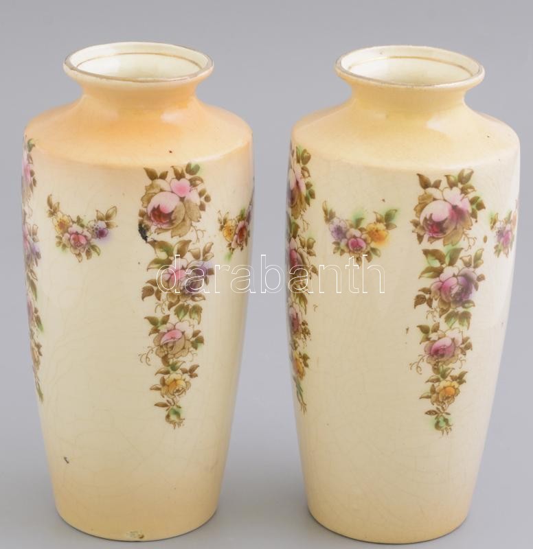 Leírás: 2 db virágmintás angol porcelán váza, matricás, jelzetlen, kopásokkal, máz alatti hajszálrepedésekkel, m: 20 cm