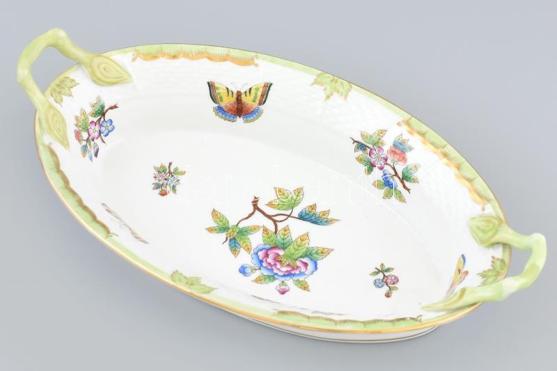 Herendi Viktória mintás tál, jelzett, füle restaurált, 31x17 cm https://www.darabanth.com/hu/426-Gyorsarveres/426.0/Porcelan-keramia-uveg/Porcelan~500006/Herendi-Viktoria-mintas-tal-jelzett-fule-restauralt-31x17-cm~II2716715