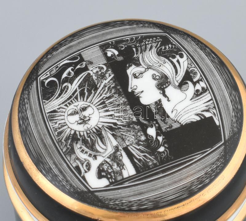 Leírás: Hollóházi porcelán Szász Endre által tervezett bonbonnier. Matricás, jelzett, hibátlan. d: 9 cm, m: 9 cm
