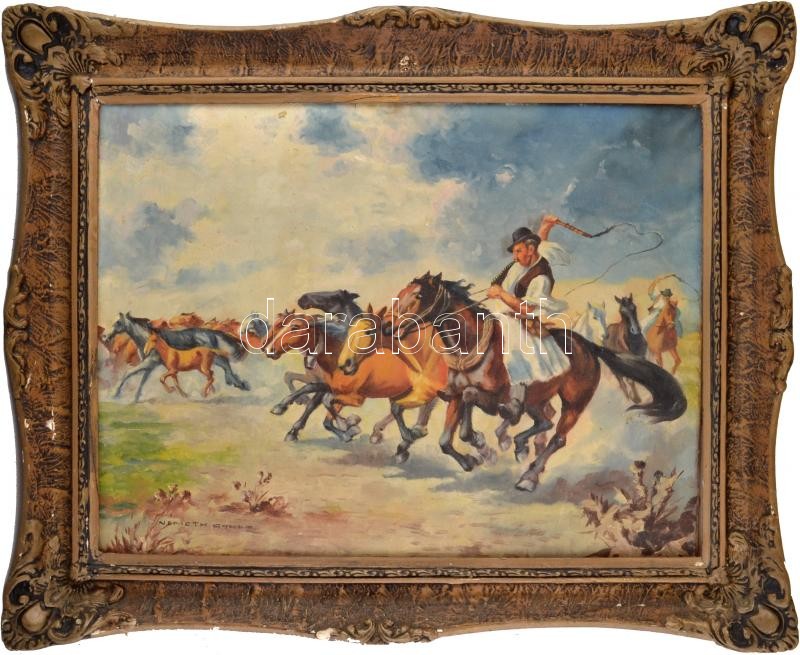 Leírás: Németh Gyula jelzéssel: Vágtató ménes csikósokkal. Olaj, vászon. Dekoratív, sérült fakeretben, 60×80 cm