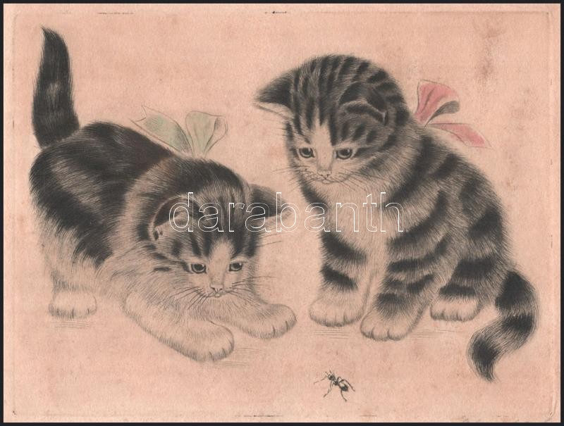 Leírás: Olvashatatlan jelzéssel: Cicák. Akvarellel színezett rézkarc, papír, kissé foltos, lap széle sérült, 15×20 cm