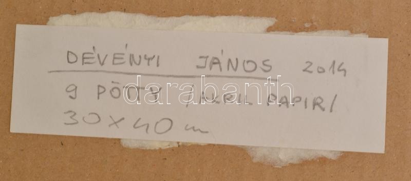 Leírás: Dévényi János: 9 pötty. Akril, papír, jelzett, üvegezett keretben 30x40 cm