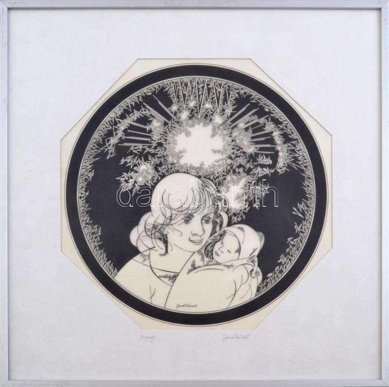 Leírás: Jurcsák László: Anyaság. Tus, papír. Jelzett. Üvegezett alumínium keretben, d: 27,5 cm