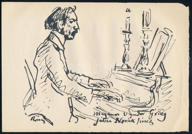 Rippl-Rónai József (1861-1927): "Magányos vándor Grieg, játssza Novák József". Cinkográfia, papír, jelzett a cinkográfián, kis lapszéli sérüléssel, 17x24,5 cm