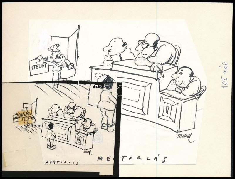 Sajdik Ferenc (1930-): Megtorlás. Tus, papír, jelzett. Az Igazság c. lapban megjelent karikatúra, hátoldalán feliratozott. Mellékelve a karikatúra fóliára készült másolata. 13x16 cm.