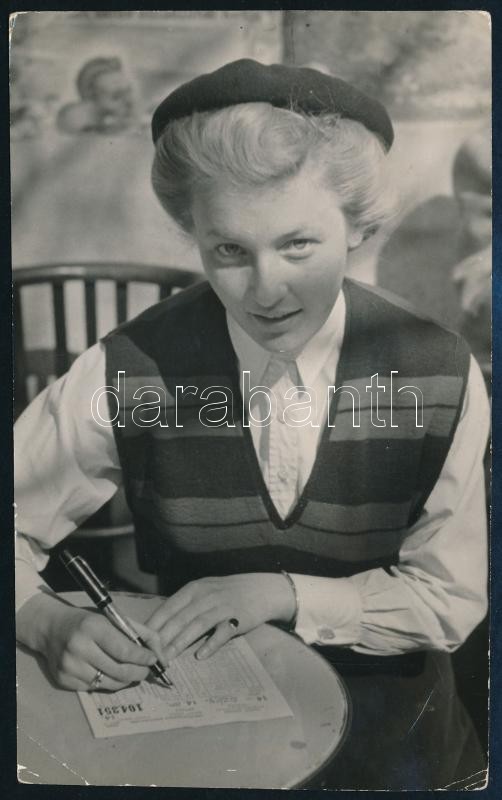 Leírás: Mednyánszky Ági (1927-2015) színésznő, fotó, sarkain törésnyomok, 17×10,5 cm
