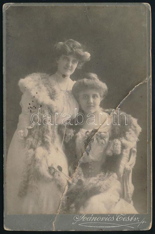 Leírás: cca 1900 Két elegáns fiatal nő, keményhátú fotó a Joánovics Testvérek kolozsvári műterméből, kabinetfotó, törésnyommal, kisebb foltokkal, 16,5x10,5 cm