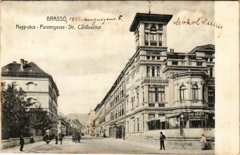 Leírás: 1910 Brassó, Kronstadt, Brasov; Nagy utca, Villa Kertsch, Eduard Binder üzlete. Herz kiadása / Purzengasse / Str. Caldararilor / street, villa, shop