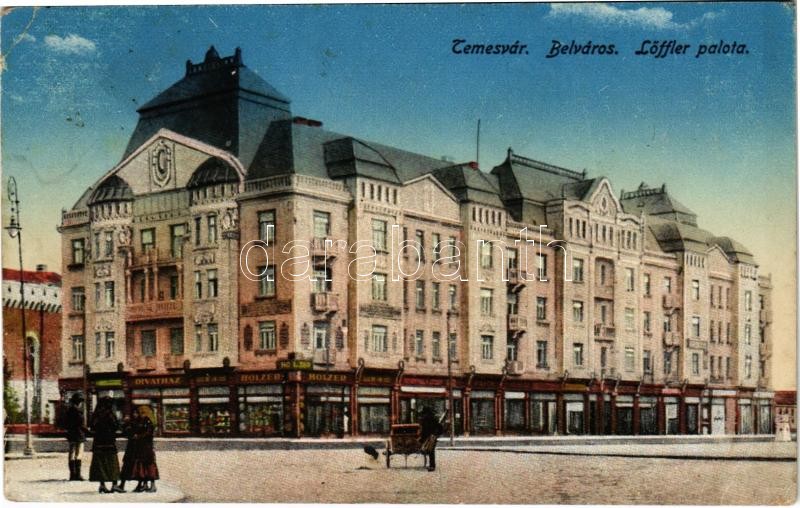 Leírás: 1919 Temesvár, Timisoara; Belváros, Löffler palota, Holzer divatház, Rosenthal üzlete / palace, shops (EK)