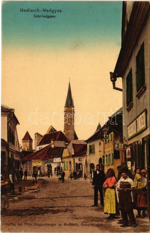 Medgyes, Mediasch, Medias; Schmiedgasse / utca, Heinrich Jinder üzlete... https://www.darabanth.com/hu/427-Gyorsarveres/427.0/Kepeslapok/Erdely~1000005/Medgyes-Mediasch-Medias-Schmiedgasse-utca-Heinrich-Jinder-uzlete-Fritz-Guggenberger-kiadasa~II2682425