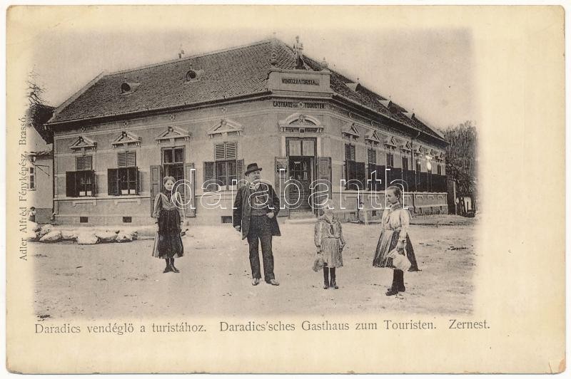 Leírás: Zernest, Zernyest, Zarnesti; Fő utca, Daradics vendéglő a Turistához, gyerekek, étterem. Adler Alfréd fényképész / main street, restaurant (EK)