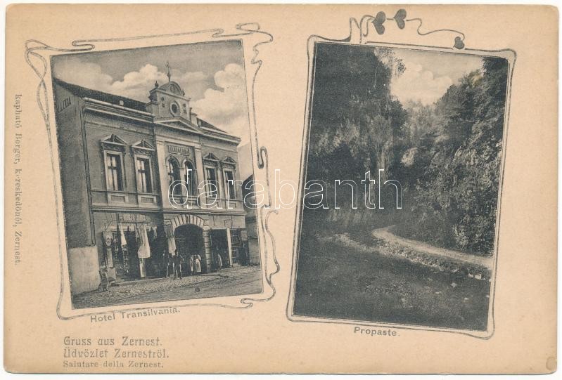 Leírás: Zernest, Zernyest, Zarnesti; Propaste, Transilvania szálloda, Borger János üzlete és saját kiadása / hotel, shop. Art Nouveau