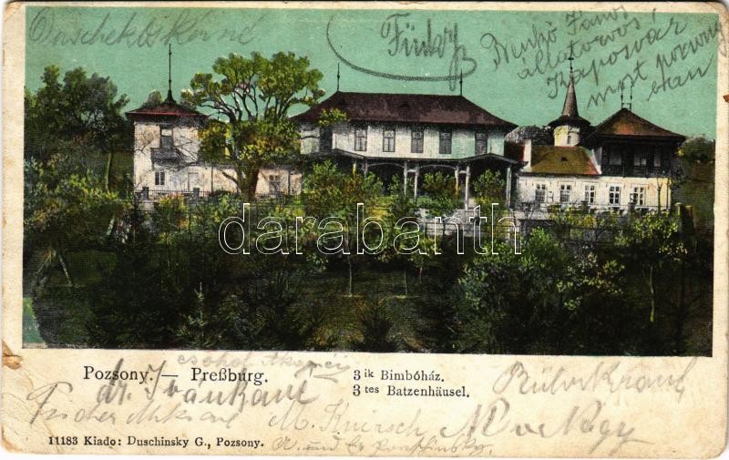 Leírás: 1907 Pozsony, Pressburg, Bratislava; III. Bimbóház étterem, nyaraló. Duschinsky G. kiadása / 3tes Batzenhäusel / restaurant, villa (EB)