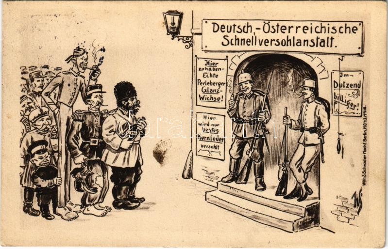 1914 Deutsch-Österreichische Schnellversohlanstalt. Wilh. S. Schröder No. 116. / Első világháborús osztrák-magyar és német (Viribus Unitis) katonai propaganda lap / WWI Austro-Hungarian and German military propaganda (Rb) + "Prüfungsstelle des b. III. Armeekorps. Nürnberg"