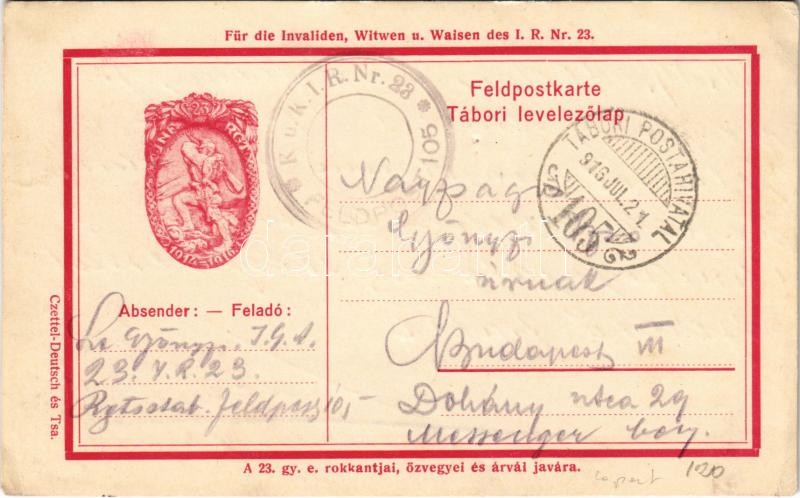 1916 A 23. gyalogezred rokkantjai, özvegyei és árvái javára tábori posta segélylap / WWI Feldpostkarte für die Invaliden, Witwen und Waisen des I. R. Nr. 23. K.u.K. (EK)