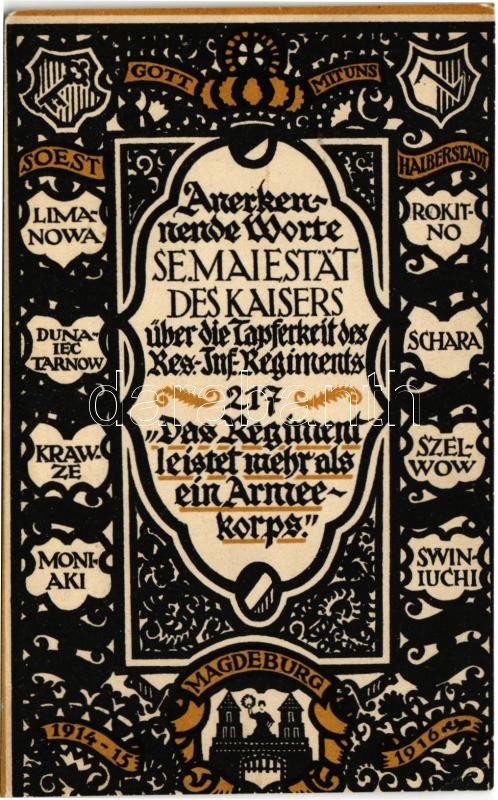 Anerkennende Worte Se. Majestät des Kaisers über die Tapferkeit des Res.-Inf.-Regiments 217. "Das Regiment leistet mehr als ein Armeekorps" / WWI German military art postcard, patriotic propaganda (EM)