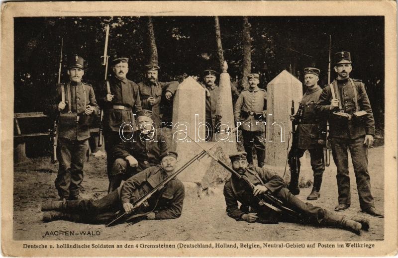 Deutsche u. holländische Soldaten an den 4 Grenzsteinen (Deutschland, Holland, Belgien, Neutral-Gebiet) auf Posten im Weltkriege. Aachen-Wald / WWI German military. German and Dutch soldiers at the 4 border markers (Germany, Netherlands, Belgium, neutral area) on posts during the World War (EK)