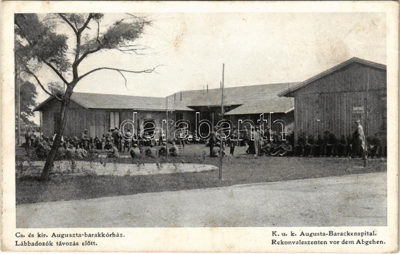 1915 Budapest X. Kőbánya, Cs. és kir. Auguszta barakkkórház, lábadozók távozás előtt / K.u.K. Augusta-Barackenspital. Rekonvaleszenten vor dem Abgehen / WWI Austro-Hungarian K.u.K. military barracks hospital + "K.u.K. Agusuta-Barackenspital in Budapest" (Rb)
