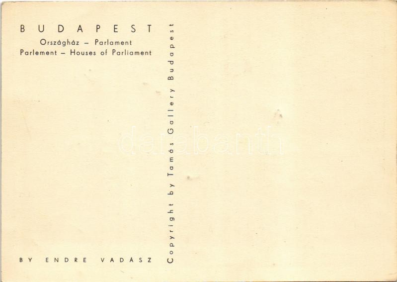 Budapest V. Országház, Parlament. Copyright by Tamás Gallery. s: Endre... https://www.darabanth.com/hu/427-Gyorsarveres/427.0/Kepeslapok/Magyarorszag~1000004/Budapest-V-Orszaghaz-Parlament-Copyright-by-Tamas-Gallery-s-Endre-Vadasz~II2728861