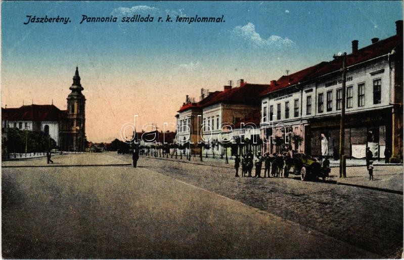Leírás: Jászberény, Pannonia szálloda, Római katolikus templom, üzletek, automobil
