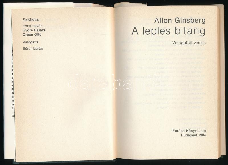 Allen Ginsberg: A leples bitang. Bp., 1984. Európa. Kiadó vászonkötésb... https://www.darabanth.com/hu/427-Gyorsarveres/427.0/Konyvek/Konyvek-Egyeb-ritkasagok~1500026/Allen-Ginsberg-A-leples-bitang-Bp-1984-Europa-Kiado-vaszonkotesben-papir-vedoborito~II2733888