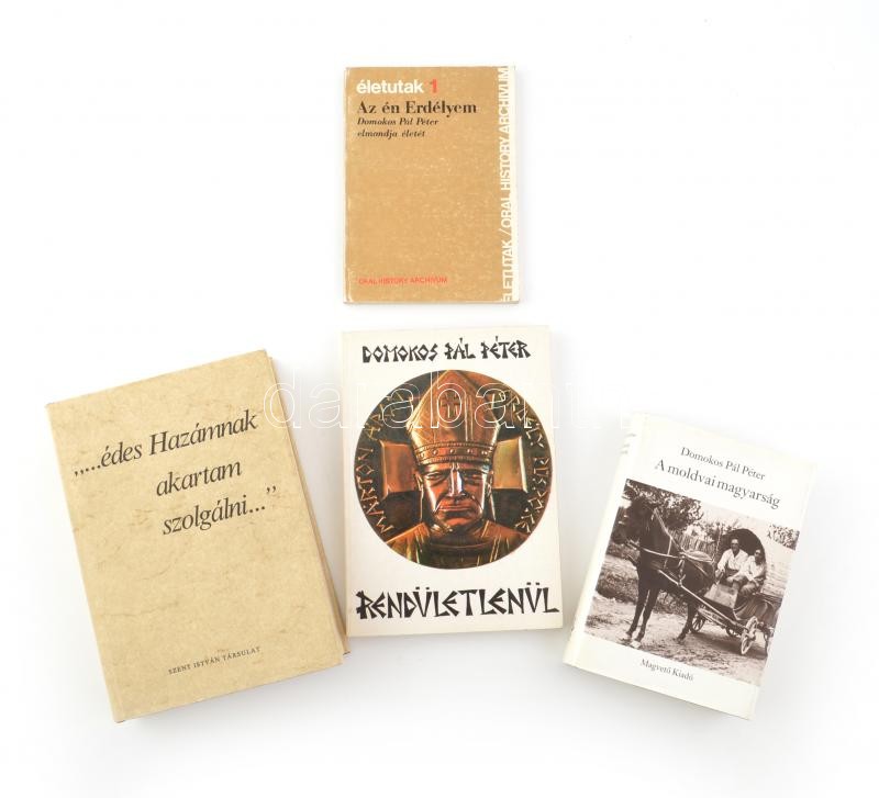 Domokos Pál Péter 4 könyve: ,,...édes Hazámnak akartam szolgálni..." Összeáll.: - - . Bp., 1979, Szent István Társulat. + A moldvai magyarság. Bp., 1987, Magvető. + Az én Erdélyem. - - elmondja életét Balogh Júliának. Életutak 1. Bp., 1988, Vita. + Rendületlenül... Márton Áron Erdély püspöke. Bp., é.n., Eötvös-Szent Gellért Egyházi Kiadó. Vegyes állapotban.