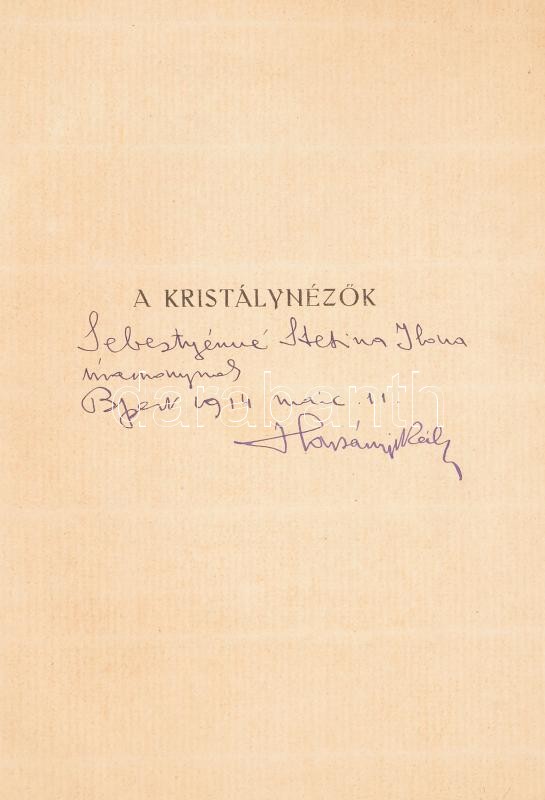 Harsányi Kálmán: A kristálynézők. Regény. Bp., 1914, Toldi Lajos (Pesti-ny.), X+(2)+317 p. Első kiadás. Kiadói papírkötés, sérült, rossz állapotban, szétváló fűzéssel. A szerző, Harsányi Kálmán (1876-1929) költő, író, drámaíró, színikritikus által DEDIKÁLT példány!