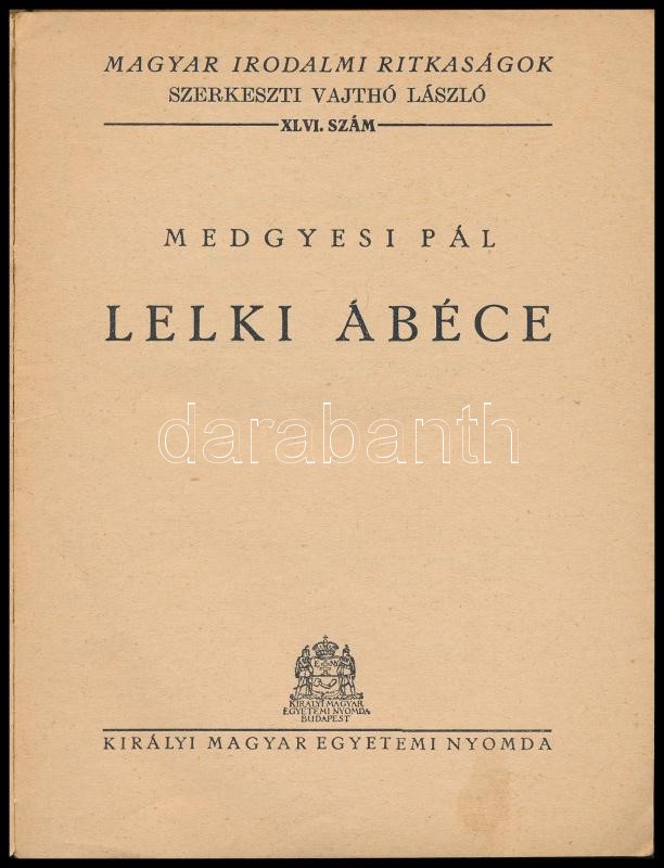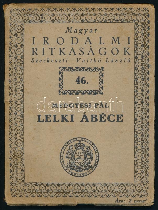 Medgyesi Pál: Lelki ábéce. Magyar Irodalmi Ritkaságok XLVI. (46.) sz. Bp., [1940], Kir. M. Egyetemi Nyomda, 150+(2) p. Kiadói papírkötés, kissé sérült, foltos borítóval