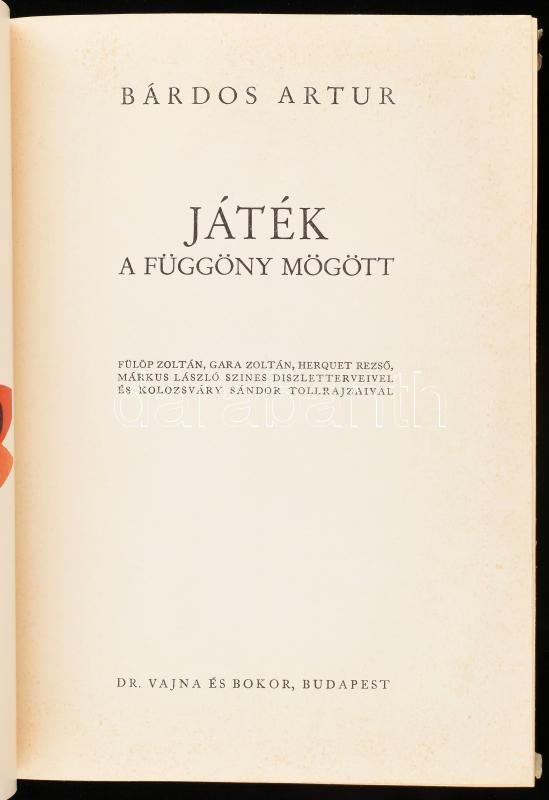 Bárdos Artur: Játék a függöny mögött. Bp., 1942, Dr. Vajna és Bokor, 210+(2) p. Lapszámozáson belül 12 képtáblával (4 színes, díszlettervek és képek) és számos szövegközi illusztrációval. A borító és a rajzok Kolozsváry Sándor munkái. Kiadói félvászon-kötés, sérült, kissé hiányos kiadói papír védőborítóban.