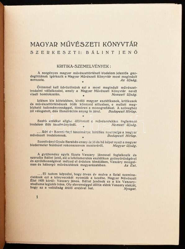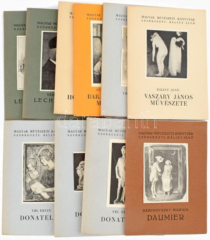 Leírás: Magyar Művészeti Könyvtár. Szerk.: Bálint Jenő. 10 kötet: Rabinovszky Márius: Daumier; Ybl Ervin: Donatello I-III.; Bálint Jenő: Vaszary János művészete; Téophile Gautier: Zichy; Szentiványi Gyula: Barabás Miklós művészete; Réti István: Hollósy Simon; Vámos Ferenc: Lechner Ödön I-II. Bp., 1927, Amicus. Kiadói papírkötés, két borítón sérült/hiányos illusztrációval, több kötetben felvágatlan lapokkal. Kiadói aranyozott, kissé fakó karton dísztokban.