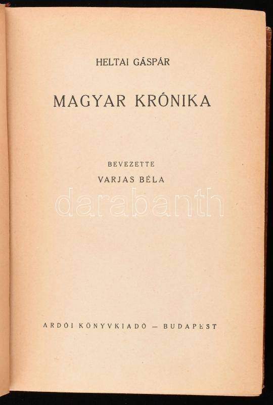 Heltai Gáspár: Magyar krónika. Bevezette: Varjas Béla. Magyar Századok. Bp., é.n., Ardói (Merkantil-ny.), XXXVII+(2)+488 p. Negyedik kiadás. Kiadói aranyozott félvászon-kötés, a gerincen néhány kis folttal.