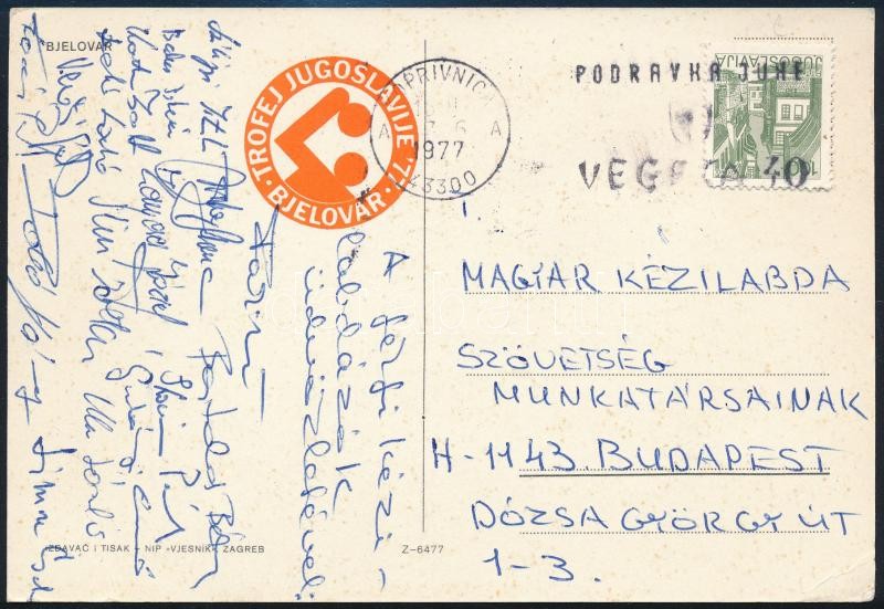 Leírás: 1977 Férfi kézilabda válogatott által hazaküldött képeslap, aláírásaikkal