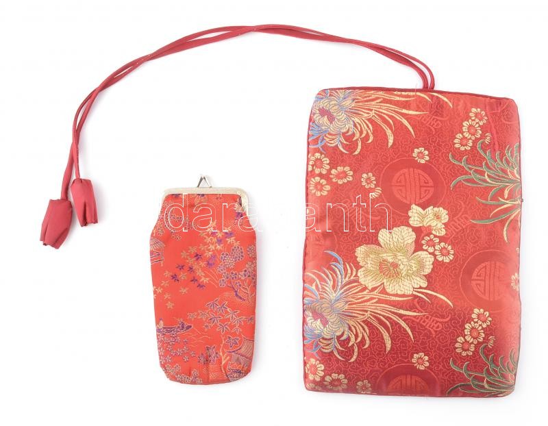 Leírás: Távol-keleti díszes bordó szatén szütyő, 26x18 cm + szemüvegtartó tok, 16,5x9 cm. Újszerű állapotban.