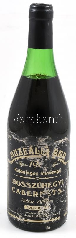 Leírás: 198? Hosszúhegyi Cabernet S[auvignon], muzeális bor, hajós-bajai borvidék, szakszerűen tárolt bontatlan palack vörösbor, kopott, sérült címkével (az évszám fele lekopott, 0,75l.