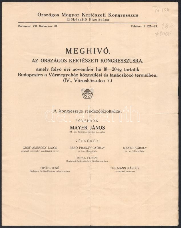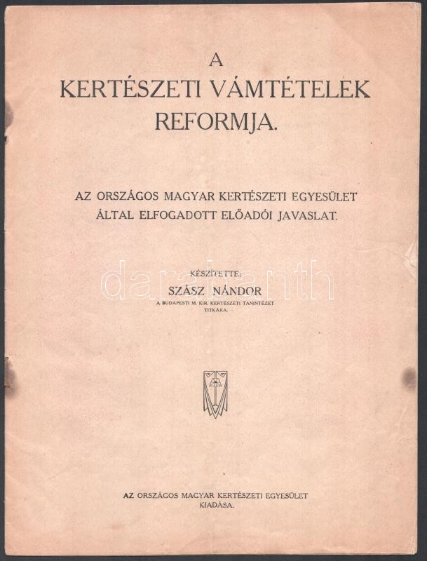1917 A kertészeti vámtételek reformja. Az Országos Magyar Kertészeti Egyesület által elfogadott elÅ‘adói javaslat. KészÃtette: Szász Nándor. 51 p. + Országos Kertészeti Kongresszus meghÃvó és 2 db kitöltetlen részvételi bejelentÅ‘lap