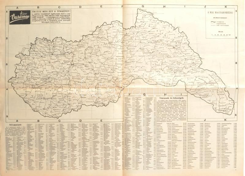 Leírás: cca 1940 Képes Vasárnap "A mai Magyarország" térképe, a visszacsatolt felvidéki területekkel és Észak-Erdéllyel, névmutatóval, 57,5x41 cm